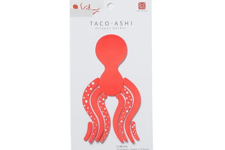 Unique sticky came out in octopus shape. It comes with 15 sets of piece of big head and long leg parts, total 135 pieces are included. Each part is right for using as either sticky or book mark and the head part is right size for taking notes. Random use on documents or books looks as if octopus is crawling out from things. Fun sticky for both users and watchers.